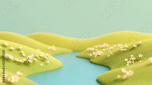 Flowing river surrounded by lush green hills nature scene tranquil environment aesthetic viewpoint serenity concept
