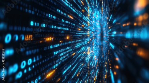 Flowing streams of binary code across a dark digital space, creating a technological and futuristic atmosphere.