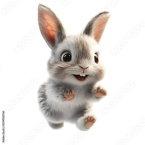 Fluffy 3D Cartoon Rabbit Hopping with Oversized Ears Isolated on Transparent Background
