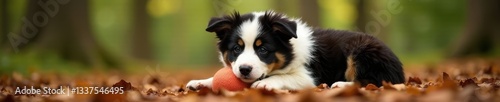 Fluffy Border Collie puppy rests, ball nestled close, forest background, headshot, dog photography, adorable puppy