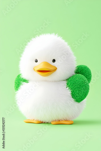 Fluffy chick stands, green accents, studio shot, simple light background
