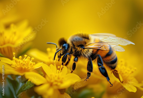fluffy, fluffy bee with transparent wings collecting flower pollen against, isolated yellow background