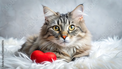 Fluffy Gray Tabby Cat with Red Heart on Paw Against Soft White Fur Background - Adorable Pet Photography for Cat Lovers and Animal Enthusiasts