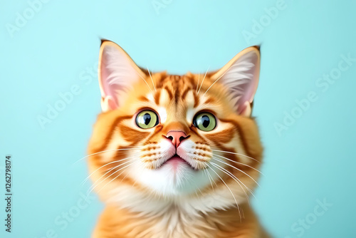 cat, orange, fluffy, green eye, curious, playful, pet, domestic, animal, felino, portrait, closeup, studio, background, cute, whisker, ear, expression, face, adorable, looking, vibrant, colourful, home, indoor, young, bright, attention, personality, friendly, inquisitive, head shot, tabby, breed, charming, captivating, expressive, photo, studio shot, high-coloured, light blue