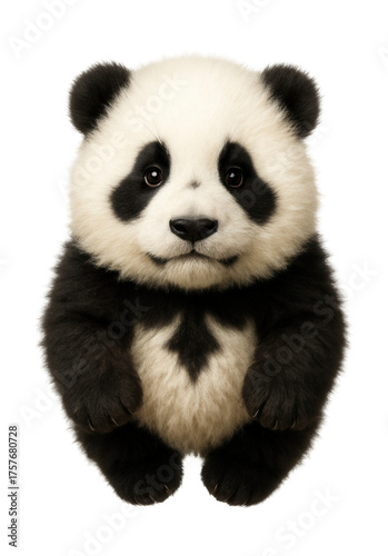 Fluffy panda cub with unique facial markings.