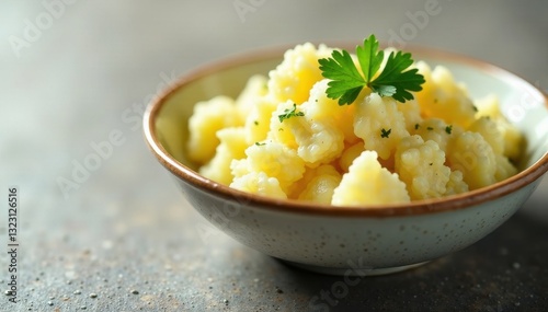 Fluffy potato salad, parsley sprig, speckled stoneware, peas, salad