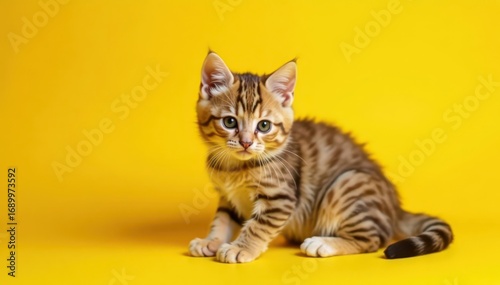 Fluffy tabby kitten, playful pose, vibrant yellow backdrop, animal photography, background, white