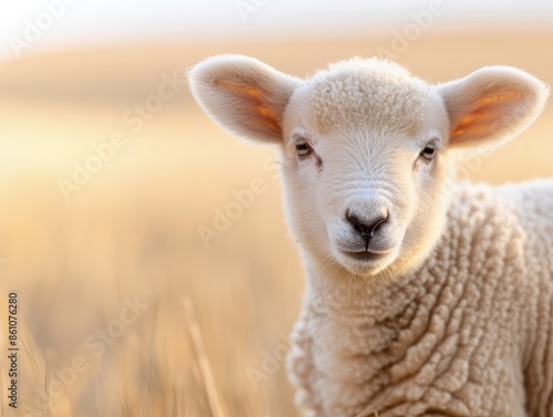 Fluffy White Lamb With Orange Ear Tags Relaxing in Open Field