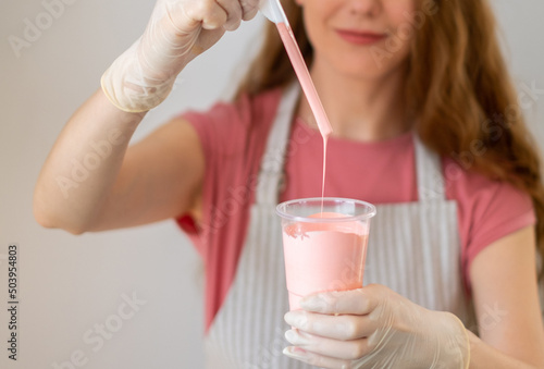 Fluid art technique. Female artist works on abstract fluid art painting, mixing acrylic colors. Painter in process create artwork in an art studio. High quality photo.