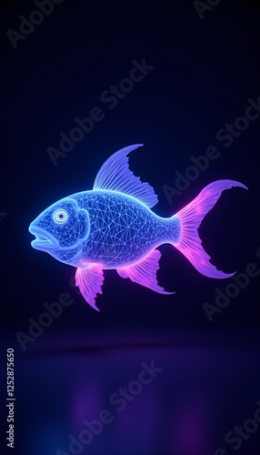 fish, wireframe, neon, hologram, futuristic, glowing, digital, science fiction, geometric, aglow, fluorescent, surreal, vibrant, cybernetic, ocean, shimmering, angular, blue, purple, pink, radiant, pulse, aethereal