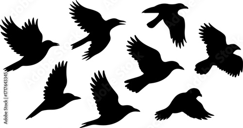 "Flying Crow Silhouette Vector Collection" "Black Raven Silhouettes Bundle – Birds in Flight" "Set of Crow and Raven Flying Bird Silhouettes"