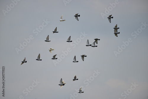 Flying pigeons in the blue sky