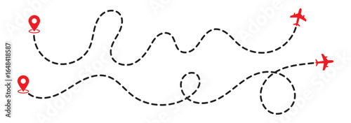 Flying plane with trail symbol. airplane icon with trace path. Travel and tourism concept. Airline flight takeoff silhouette. Black airplane line path with location point icon. eps 10