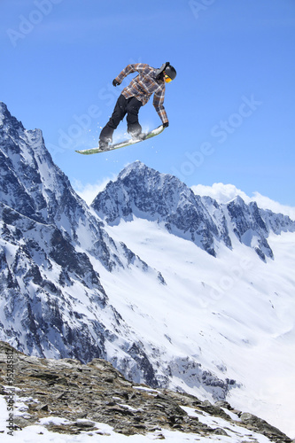 Flying snowboarder on mountains, extreme sport