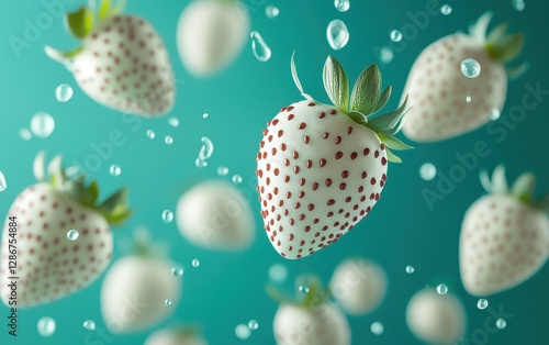 Flying white chocolate-covered strawberries on a deep teal background Easter Day