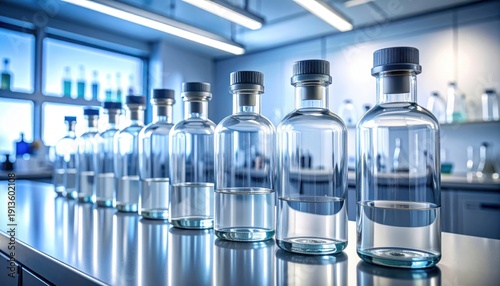 laboratory, sterile, reagent, bottle, science, glasses, empty, lined, row, polished, bench, focused, clear, transparent, cap, light, clean, precision, equipment, research, medicals, chemistry, pharmaceutical, labware, storage, container, liquid, water, blue, modern, health care, technology, analytical, chemical, study, experiment, development, clinic, hospital, environment, work, professional, product, display, perspective, sharp, bright, orderly