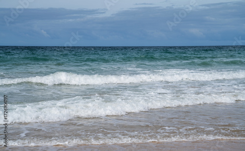 Foamy waves gently kiss the sandy shore, a dance of sea and land under the expansive blue sky, the essence of peaceful beach side tranquility