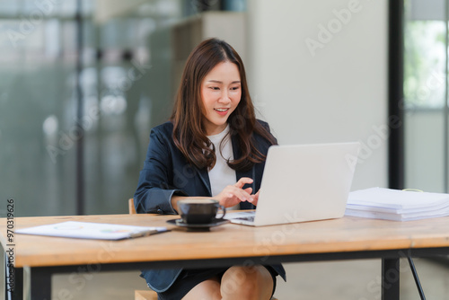 businesswoman, asian, laptop, office, work, business, professional, computer, technology, desk, corporate, working, cyberspace, woman, success, confident, female, career, executive, entrepreneur, online, typing, smiling, happy, determined, modern, workplace, communication, electronic mail, browsing, project, task, deadline, sharpened, concentration, tied-up, efficient, productive, organised, paperwork, coffee break
