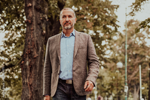 Focused businessman in a suit walking in the park