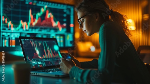 Focused businesswoman analyzing financial trends on laptop and tablet with candlestick charts in modern office setting