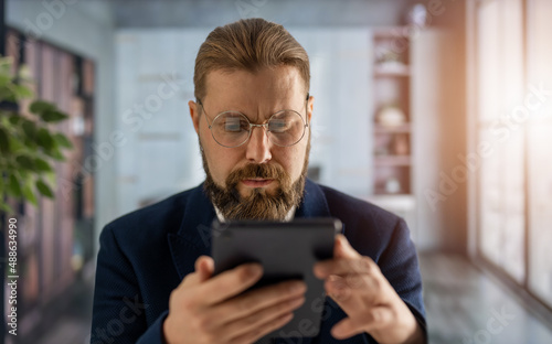 Focused caucasian man in eyeglass and formal suit sitting at modern office with digital tablet in hands. Bearded businessman surfing internet at workplace.