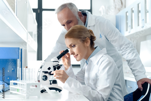 focused caucasian scientists in white uniform working with microscope and reagents in chemical laboratory