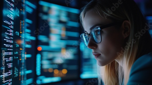 focused, caucasian, young, female, programmer, analysing, computer, screen, code, technology, goggles, concentration, digital, datum, software, development, expert, professional, tech, engineer, information technology, workstation, laptop, monitor, display, binary, coding, interface, desktop, sharpened, workspace, electronic, cyberspace, network, hacking, precision, programming