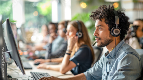 Focused customer support agent with a headset working at a computer, surrounded by colleagues, delivering excellent service in a bright office.