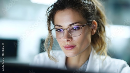Focused female scientist wearing glasses examines data on a computer screen in a bright laboratory