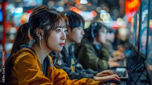 gamer, woman, earphones, arcade, computer, screen, focused, bright, light, technology, gaming, playing, concentrated, keyboard, mouse, colourful, cyber, competition, digital, virtual, entertainment, player, team, strategy, control, skill, fun, passion, competitive, action, interactive, online, community
