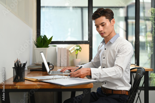Focused handsome male entrepreneur using laptop, managing his small business from home
