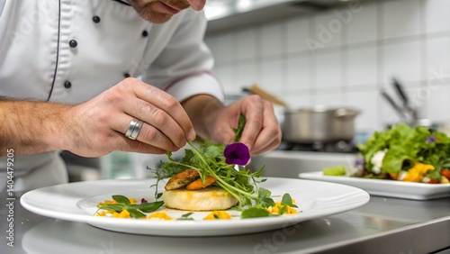 Focused image of a chef adding final touches to a plated dish, showcasing culinary artistry. Perfect for gourmet food advertisements, restaurant branding, and culinary publications.