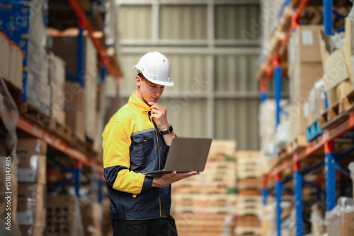 Focused industrial worker stands in a warehouse corridor, updating stock records on his laptop and reviewing shelf contents. Logistic industry with technology...