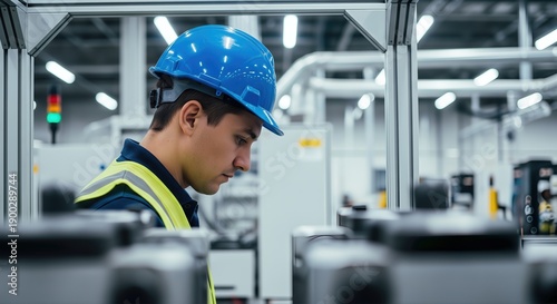 engineer, technician, male, man, hard hat, factory, manufacturing, industry, production, machinery, equipment, automation, technology, inspection, maintenance, work, job, professional, concentration, focused, half face, closeup, blue, industrial, modern, clean, indoor, lighting, bokeh, depth of field, operation, quality control, men at work, labor, skilled, precision, system, assembly line, control panel, serious
