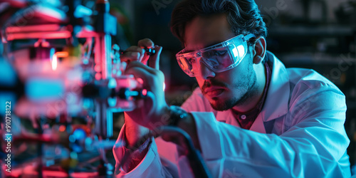 scientist, laboratory, experiment, equipment, neon, research, science, technology, laboratory, goggles, male, professional, precision, technician, innovation, engineering, discovery, scientific, analysis, chemistry, exam, sharpened, instrument, labcoat, testing, observation, mechanic, exploration, workspace, expertise, skill, concentration, hand, biochemistry, physics, chemical, futuristic, analytical
