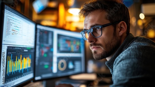 analyst, datum, chart, graph, businessman, computer, screen, monitor, technology, business, office, workplace, professional, serious, concentrated, working, analysis, statistic, information, digital, network, coding, programming, developer, engineer, finance, market, trading, stock, investment, growth, progress, success, future, innovation, strategy, planning, research, development, solution, problem, solving, sharpened, goggles, beard, man, male, adult
