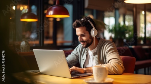 Focused man with headphones working on laptop in a cafe.