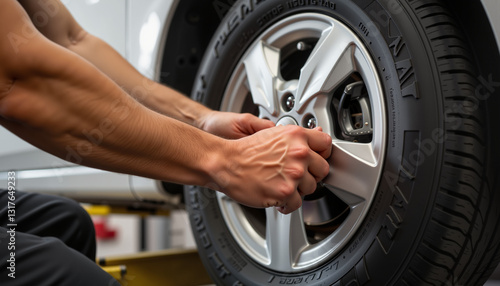 Focused mechanic tightening bolts on a car wheel, automotive precision