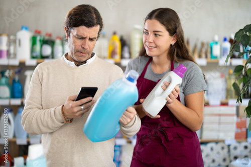 Focused middle-aged man scanning barcode of detergent bottle with smartphone, comparing prices or checking product reviews, while polite female store employee offering alternative cleaning product