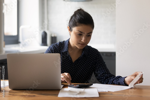 Focused millennial Indian woman counting budget, checking financial documents with receipts, using calculator, app on laptop for online payment. Computer user doing accounting work from home