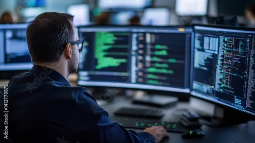 Focused professional programmer working on multiple computer screens in office setting : Generative AI