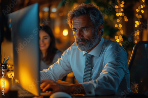 professional, office, collaboration, computer, business, colleague, evening, concentration, work, urban, lighting, productivity, teamwork, setting, dedication, attire, warm, atmosphere, modern, workspace, engagement, serious, discussion, technology, adult, male, female, interaction, sharpened, creativity, routine, inspiration, community, analysis, professionalism, life events, relaxed, communication, organisation, determination, innovation, casual attire, project, design, innovative, growth, environment, generative
