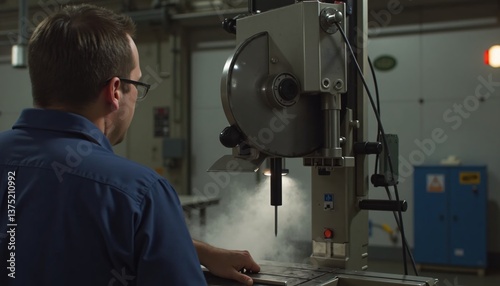 focused, shot, technician, using, industrial, saw, back, view, ai, generative, machine, equipment, industry, metal, factory, technology, steel, tool, work, lathe, men at work, engine, engineering, power, plant, camera, iron, production