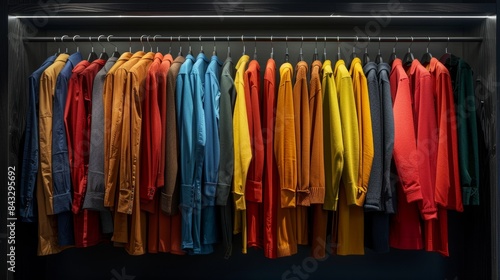 Focused shot of clothes on a rail, colorful fabrics, contemporary hanging shelf, sharp and clear lighting