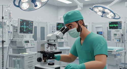 Focused surgeon meticulously examines a sample under a powerful microscope in a modern operating room.