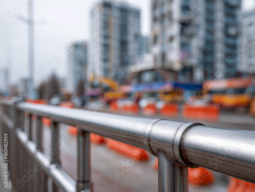 Focused view of a steel railing with a blurred busy urban street scene featuring construction barriers and tall buildings in the background on a cloudy day
