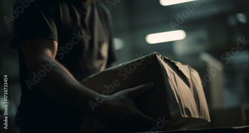 Focused warehouse worker carefully handles a package in a dimly lit industrial setting during a candid moment of operations