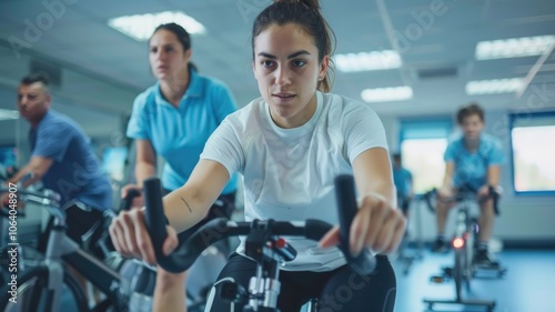 woman, exercising, stationary, bike, cycling, fitness, gym, physical exercise, spin, class, training, cardio, health, athlete, group, indoor, active, exercise, people, spinning, dedication, focused, wellness, sport, routine, concentration, intensity, motivation, endurance, energy, teamwork, activity, healthy, lifestyle, performance, perspiring, strength, determination, equipment, effort, motion, high technology, modern, technology, community, challenge, physical