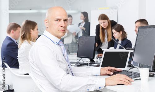 Focused young successful man working with laptop in busy modern open plan office