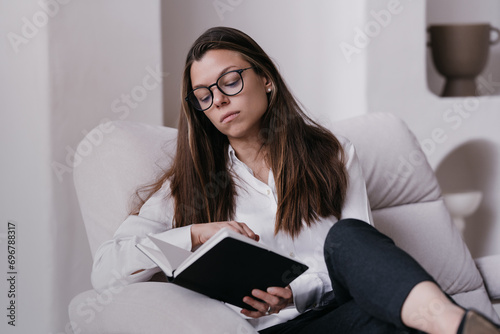 Focused young woman reading a book on an armchair, wearing glasses, in a serene white room, embodying a peaceful moment of leisure and learning